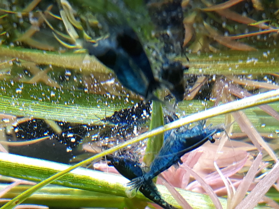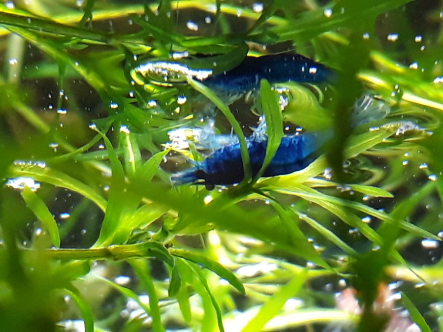 Mêmes crevettes ,des blue velvet ,sur chacune de ces photos ,mais j’aime beaucoup les voir grignoter sous la surface de l eau ,non seulement j aime cet effet miroir ,les nuits étoilées dûes au saupoudrage de nourriture en suspension mais aussi leur robe magnifique sous l éclairage ….au joli bleu foncé translucide alors