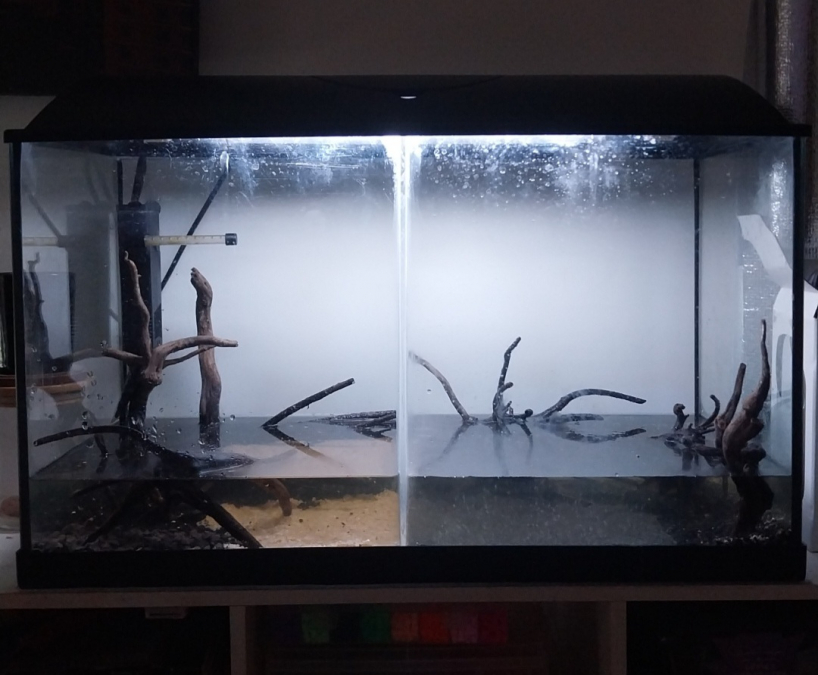 Je pars avec une base d' un bac de 60L divisé en 2 par une plaque de verre scellée. Donc 2 bacs dans un (30L brut chacun).