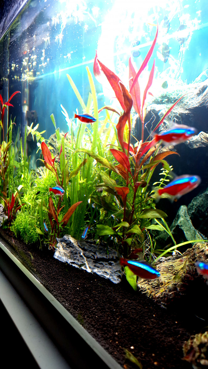 J'ai par contre un soucis d'algues depuis le début, il faut dire que la bac est sur 3 faces, près d'une fenêtre. J'ai installé 2 stores avec des ventouses pour les jours de forte luminosité et cela se calme un peu. Il faut aussi que les plantes grandissent encore... patience patience...