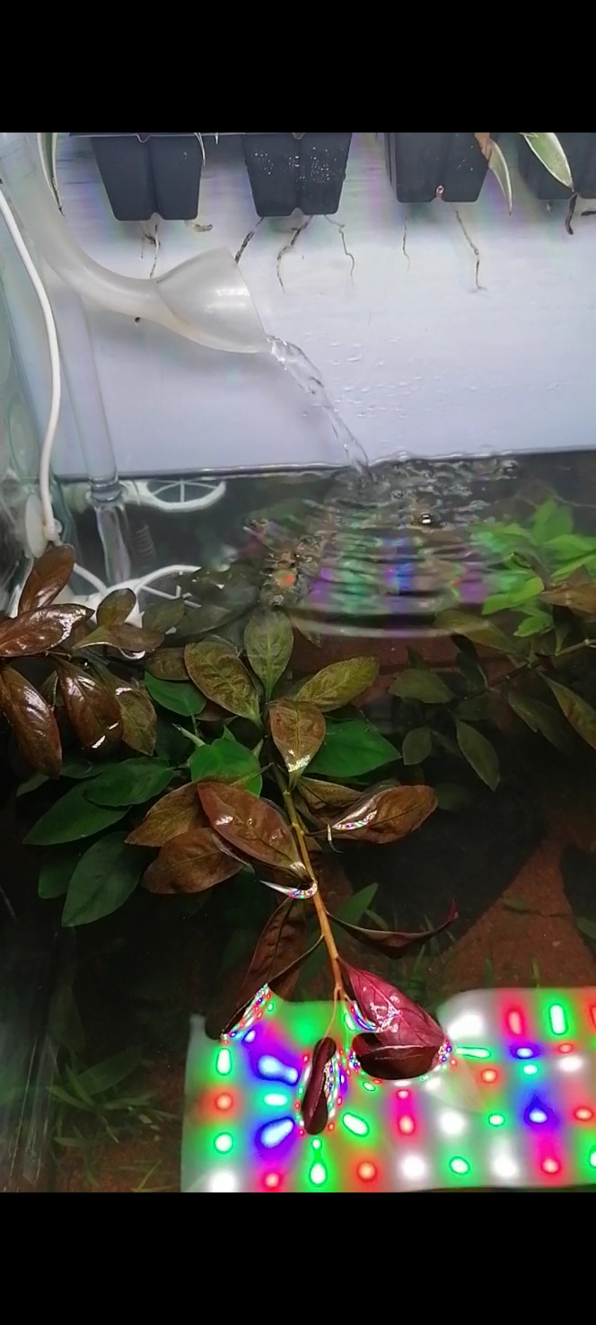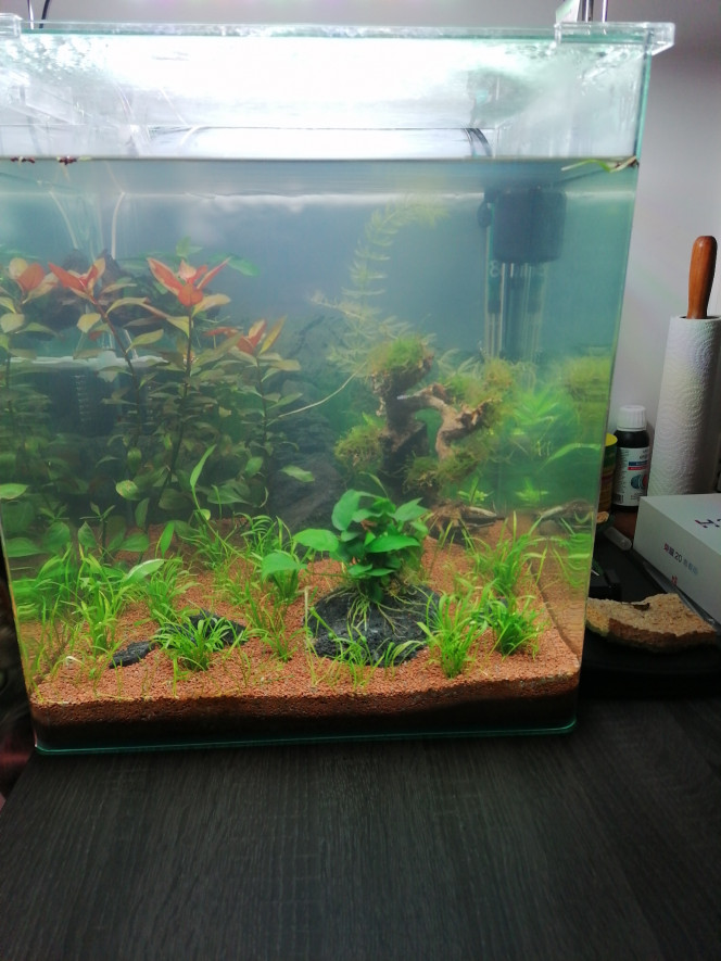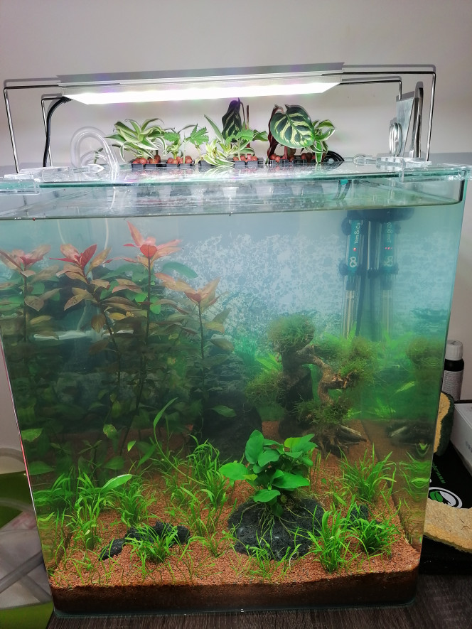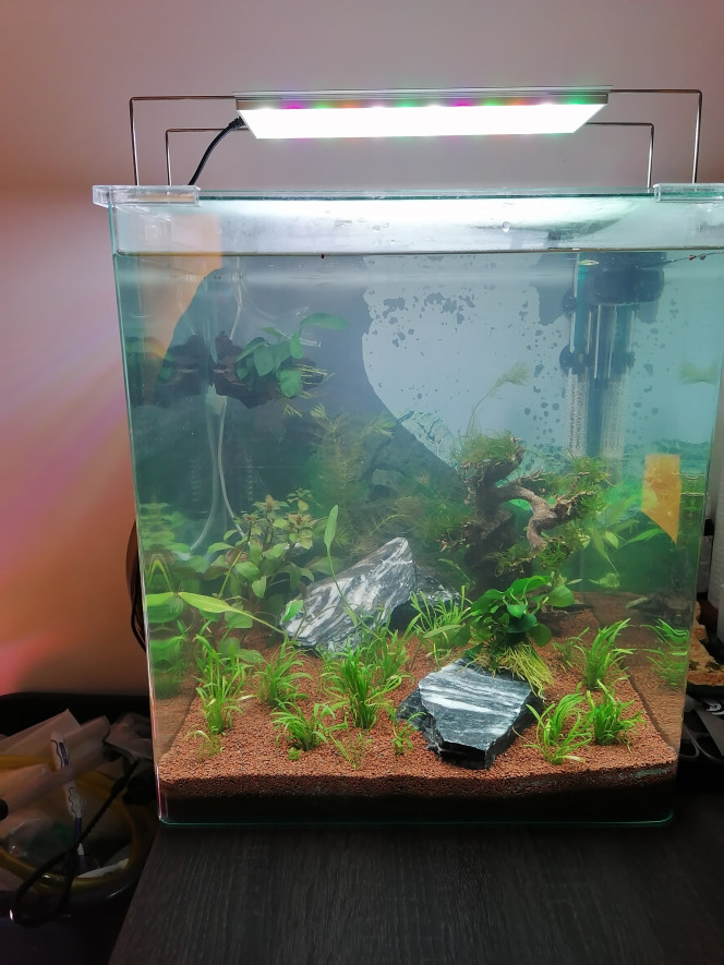 Le vendeur m'a conseillé en parallèle de mettre quelques aliments pour poissons pour aider à cycler (boules blanches sur photos). J'ai planté 2 limnophila sessiliflora, 1 myriophyllum spec. et 2 cryptocoryne lucens. Mon sol est en manado. J'ai relevé les paramètres ce matin et semblent tous. La température est à 25°C et j'éclaire de 12 à 18h avec une rampe led de 1650 lumens.