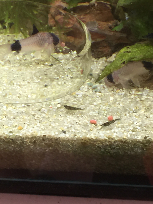 Il y a 2 ou 3 crevettes grainées et... les darios n'attaquent plus les crevettes adultes. :)