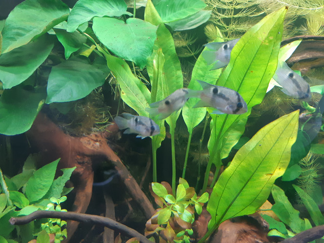 Sur les photos, dans le fond de l'aquarium, on ne peut pas distinguer les alevins, ils sont justes en dessous de chaque parent.