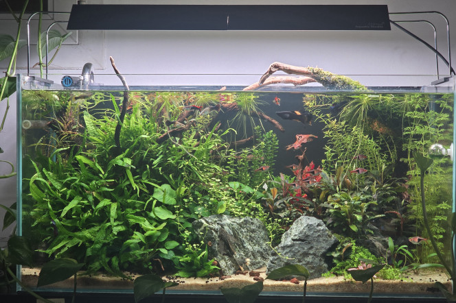 Bonjour à tous, nouveau venu sur le forum, je suis en cours de lancement sur un aqua de 300L. Le hardscape est fait (Coeur sur aquadesigner shop et M. Wolinski) et nous sommes en cours de dark start depuis maintenant une semaine et demie et ce jusqu'au 01/11.