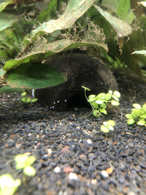 Les corys fouillent les fonds, les guppies se balladent et picorent dans les plantes de temps en temps, j'ai vu quelques bébés corys courir sur le sable et aller se cacher... mais la petite guppy a peut-être un problème?