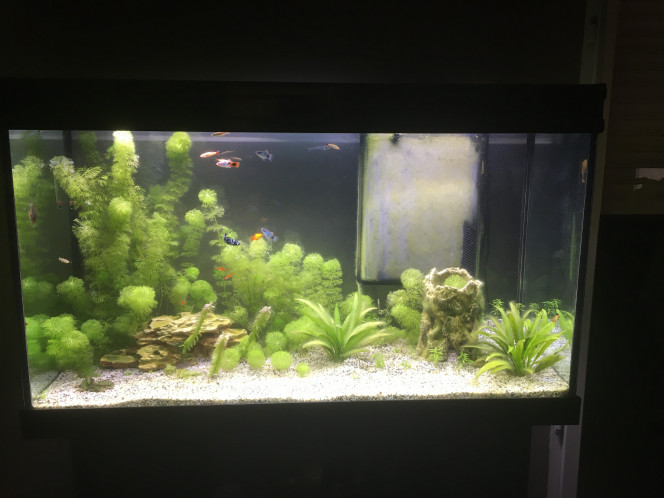 Salut à tous, voici mon aquarium en cours de cyclage depuis 2 semaines. J'ai depuis une semaine des algues très longue qui poussent et qui s'accroche partout. J'ai fait un nettoyage ce WE mais revenu très vite.
