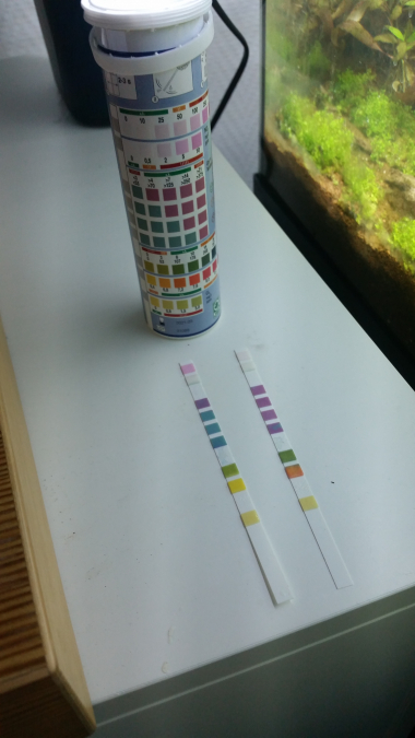 Bonjour à tous! Je viens vous demander conseil car je trouve mes tests d'eau assez bizarre... À gauche un aquarium mis en eau depuis 2 ans 100% volvic, il indique un taux de No3 assez haut que je n'arrive pas à comprendre surtout que tout mes pensionnaires vont bien... À droite un aquarium actuellement en cyclage, il est à 2/3 d'eau osmosee et pourtant a un gh et ph bien plus élevé que le pre... Afficher la suite