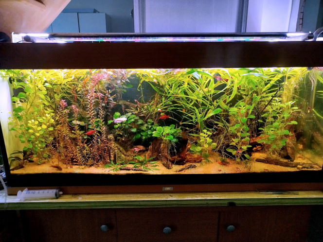 Donc voilà ce que ça donne. Je n’ai pas pris des photos très belles, il faudra que j’en refasse. Les cryptocorynes sont reparties sans problème, les anubias/buce vont aussi bien. Mes salvinia avaient beaucoup disparu, mais j’en ai rajouté un peu et ça semble repartir doucement. Les poissons sont toujours au top, et finalement, la naja a donné davantage de cachettes. N’hésitez pas à donner un avis !