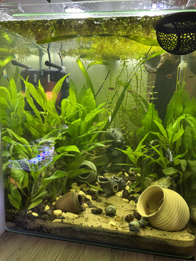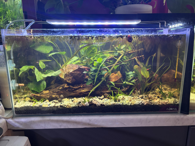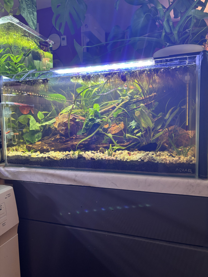 Tout ce petit monde s'entend et se mélange à merveille. La betta a un tempérament très cool, je ne regrette pas d'avoir craqué.