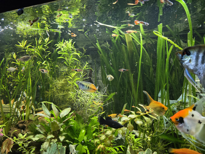 Mon bac est bien planté comme vous pouvez le voir. Concernant les paramètres j'ai longtemps traîné des nitrites(Cyclage 3 semaines avec la bêtise de tester avec les bandelettes), qui semblent aujourd'hui mieux maîtriser (je dépasse rarement les 0.1mg/l, j'oscille entre 0-0.025 et 0.05 depuis 2 semaines. Les nitrates entres 3-10 max. Par contre le p04 je suis un peu haut, autour de 0.3 mg/l et je n'en trouve pas la source d'où mon post. J'ai fait un changement d'eau(environ 25% soit 12.5L) récemment après avoir laisser le bac tranquille pendant 1 mois, j'ai constaté que les p04 n'ont pas bougé. Le Ph je suis autour de 7-6.8, le Kh à 7, le c02 autour de 20(j'ai un doute mais j'injecte depuis des semaines 2 bouteilles de c02 bio dennerle).