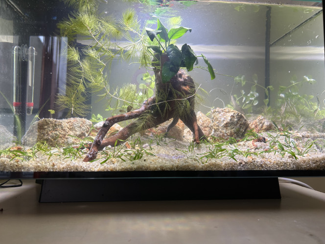 belle racine, personnellement je rajouterais des plantes comme des vallisnéries à l'arrière