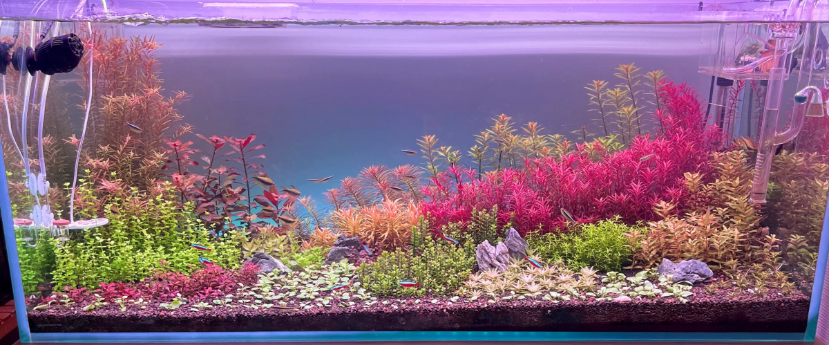 On ne le voit pas sur les photos, mais le tuyau est placé en haut à gauche, au point le plus haut de l’aquarium, afin que toute la surface plantée en profite.