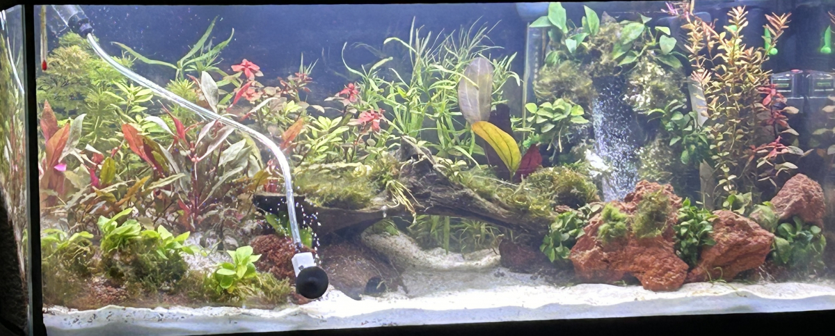J'ai fait beaucoup d'erreurs, notamment avec mon diffuseur de CO2 qui fonctionnait mal, pas assez de plantes donc j'ai eu un envahissement d'algues/ champignons sur ma racine qui s'est énormément développé avec le kit engrais DENNERLE que j'ai utilisé. J'ai donc opté pour des crevettes (qui je vous assure ne sont pas du tout agressé par les barbus) + de l'anti algues EASY LIFE et arrêt du kit d'engrais évidement.