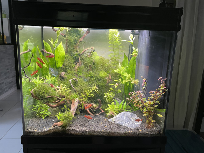 Hello à tous, Je viens de lancer un bac de 60L avec système de CO2 et uniquement des plantes. Je compte intégrer uniquement des crevettes d'ici 3 semaines. Bac de 3 semaines et pour le moment pas mal d'algues en espérant qu'il disparaissent d'ici 1 semaines. Vous avez quelques conseils à me donner ? Voici quelques photos. Belle journée et merci d'avance pour vos retours et... Afficher la suite