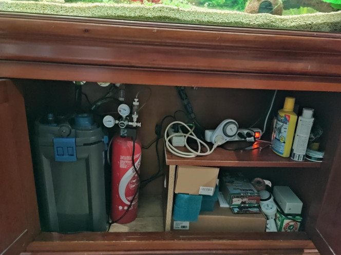 Filtre Oase Biomaster 600 thermo, rampe led Chihiros 9500lm, système co2 sur extincteur et diffuseur sur retour JBL avec électrovanne et horloge.