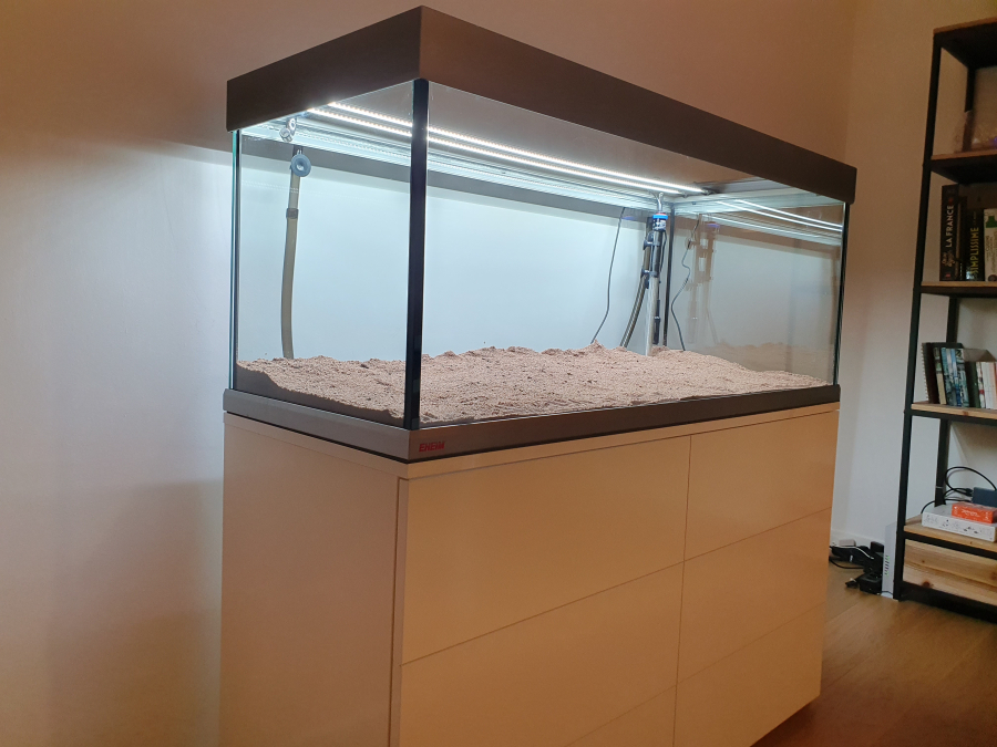 Aquarium après quelques améliorations : Modification afin de pouvoir fusionner l'aquarium de 150 L avec celui ci et qu'il puisse accueillir sa faune .