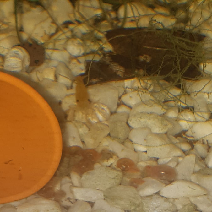 J'avais pris l'habitude de ne plus trop regarder ce bac depuis mon retour de vacances. Sans doute que la perte d'une partie de la colonie m'avait profondément démoralisée, mais tant qu'il y a de la vie, il y a de l'espoir, dirons nous. Aujourd'hui j'ai beaucoup observé le bac, j'y ai vu des crevettes magnifiques avec pour la plupart des colorations extraordinaires. Je prépare le terrain pour les prochaines générations.