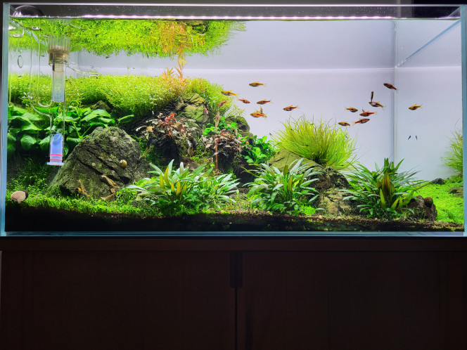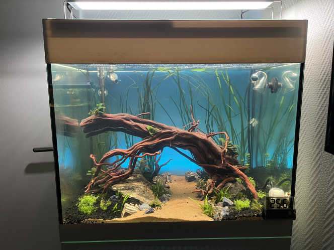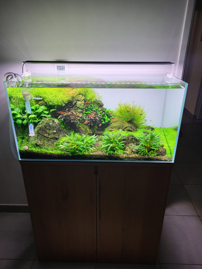 Réfection totale : Voilà le nouveau visage du 55L, pas tout à fait ce que je voulais mais j'en suis quand même contente ^^ plus qu'à attendre que les plantes se redressent et poussent... Et que je puisse obtenir de la Fissidens fontanus, celle que j'avais commandé sur Etsy était arrivée toute sèche (pas d'humidité dans le sachet), du coup il y a encore de vilains spots de colle chaude visibles, tout ça devrait aller mieux avec la mousse et après la pousse des plantes...