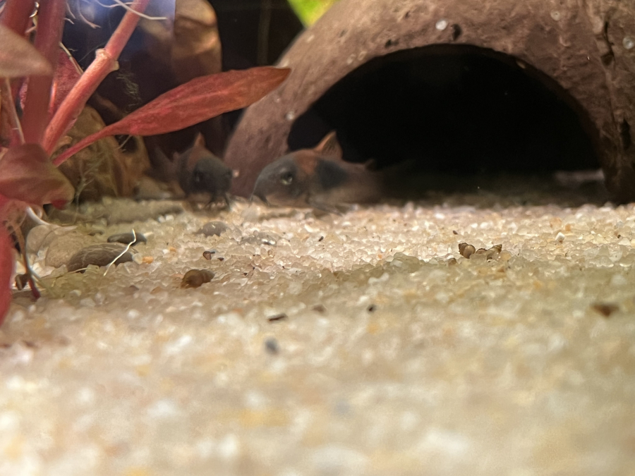 Bonjour voici quelques photos de mes alevins corydoras pygmeus j'ai nettoyé le bac ou Ilse trouve et en le remplissant j'ai attrapé des bébés crevettes donc normalement qu'il y est des crevettes sur les photos.