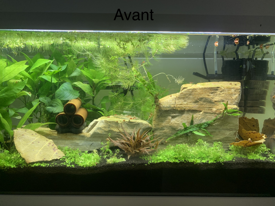 J'ai récemment acheté un osmoseur avec de quoi remineraliser l'eau dans mes proportions souhaitée. Le bac est relativement planté dont de la pousse rapide, avec pour population 11 tétras tête de cuivre, 12 corydhoras, 1 ancitrus et un couple de gourami et quelques crevettes.
