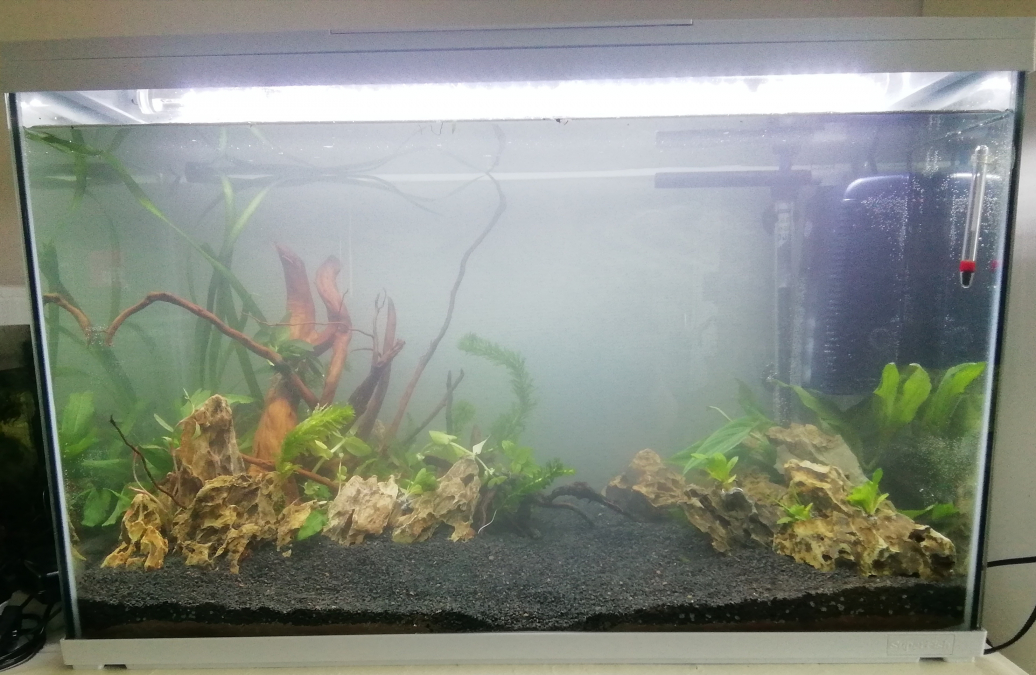 Bon, je vous envois une photo sans bubule sur la vitre frontale, j'ai ajouté, une pierre à droite. Maintenant j'ai un gros dilemme 🤔, je laisse comme ça, ou bien, j'ajoute du sable (j'ai du sansibar gris clair en stock 😅) sur la partie centrale en suivant le mouvement du "chemin", et peut être en remontant un peu vers les pierres ? 🤔, j'ai mal à la tête 🤯😂. Merci d'avance.