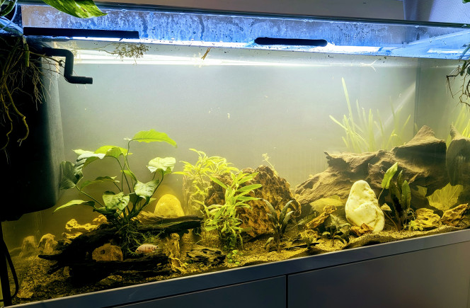 J'ai acheté sur Le Bon Coin un aquarium 110 litres pour en faire un aquarium low-tech orienté écosystémique, avec une microfaune très abondante. Il tourne depuis deux mois avec de nombreuses bestioles, escargots, crevettes, etc, j'y ai ajouté des rasborra galaxy hier, et jusqu'à présent tout se passe bien.