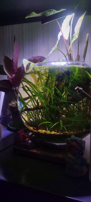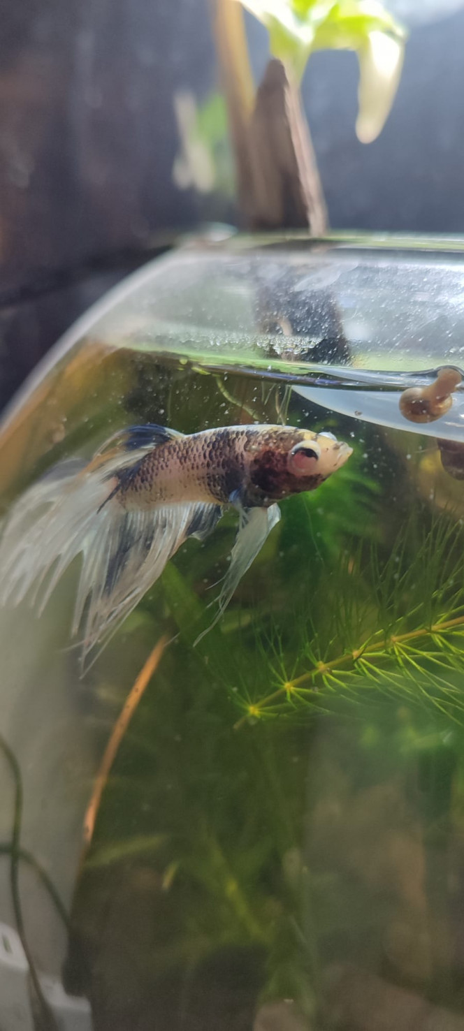 Je ne conseillerai a personne de mettre un betta dans un aquarium boule si petit, mais pour lui, ça fonctionne. Les vitres bombées font une pente douce vers la surface et le petit volume lui permet de se repérer dans le bac sans être perdu. Je ne l'imagine pas dans plus grand que ça vu comment il galère.