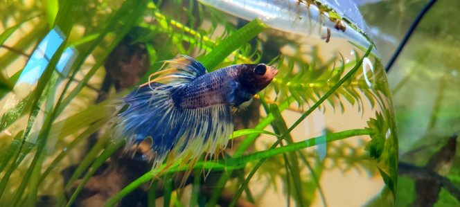 J'ai acheté ce betta car il me faisait pitié. Il est arrivé à l'animalerie, il avait déjà perdu ses deux yeux (d'après les vendeuses). Elles le bradaient à 4€. Il avait une pourriture des nageoires et un exophtalmie des deux côtés. J'avais un bon d'achat de 5 euros et un aquarium boule cyclé.