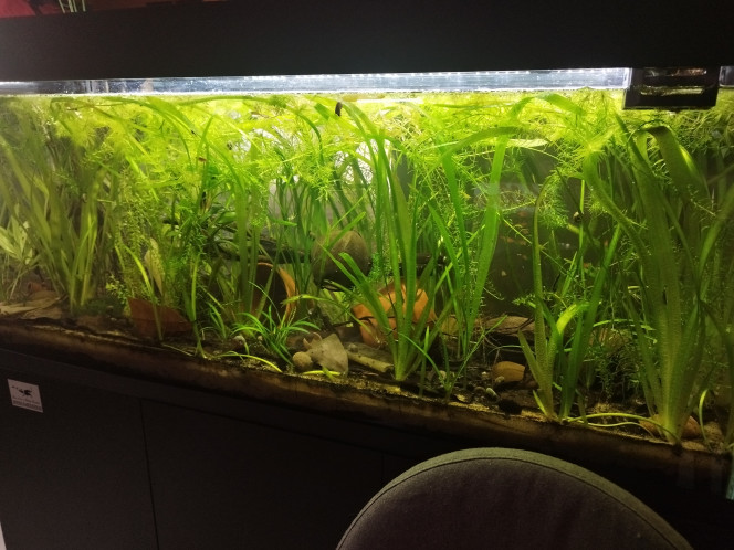 En tout cas c'est une super idée. Faut juste que tu trouves les bons poissons... Pas trop gros et pas trop petits et pas en mettre beaucoup. Si tu ne veux pas de filtres, il faut beaucoup de plantes, même flottantes. Je te déconseille la lentille...trop difficile à gérer. Person j'ai de la salvinias. C'est aussi envahissant mais plus facile à enlever. Quand à mettre des choses de dehors, je le fait mais j'habite en campagne.... Dans mon bac j'ai de la vase et des vitres un peu sales mais pour la microfaune c'est obligatoire et ça fait...naturel...😉 Va falloir que tu fasses aussi au feeling. Ce qui fonctionne pour un aqua ne fonctionnera pas forcément pour un autre.... Et voilà ce que ça donne.... Ton projet est réalisable.👍