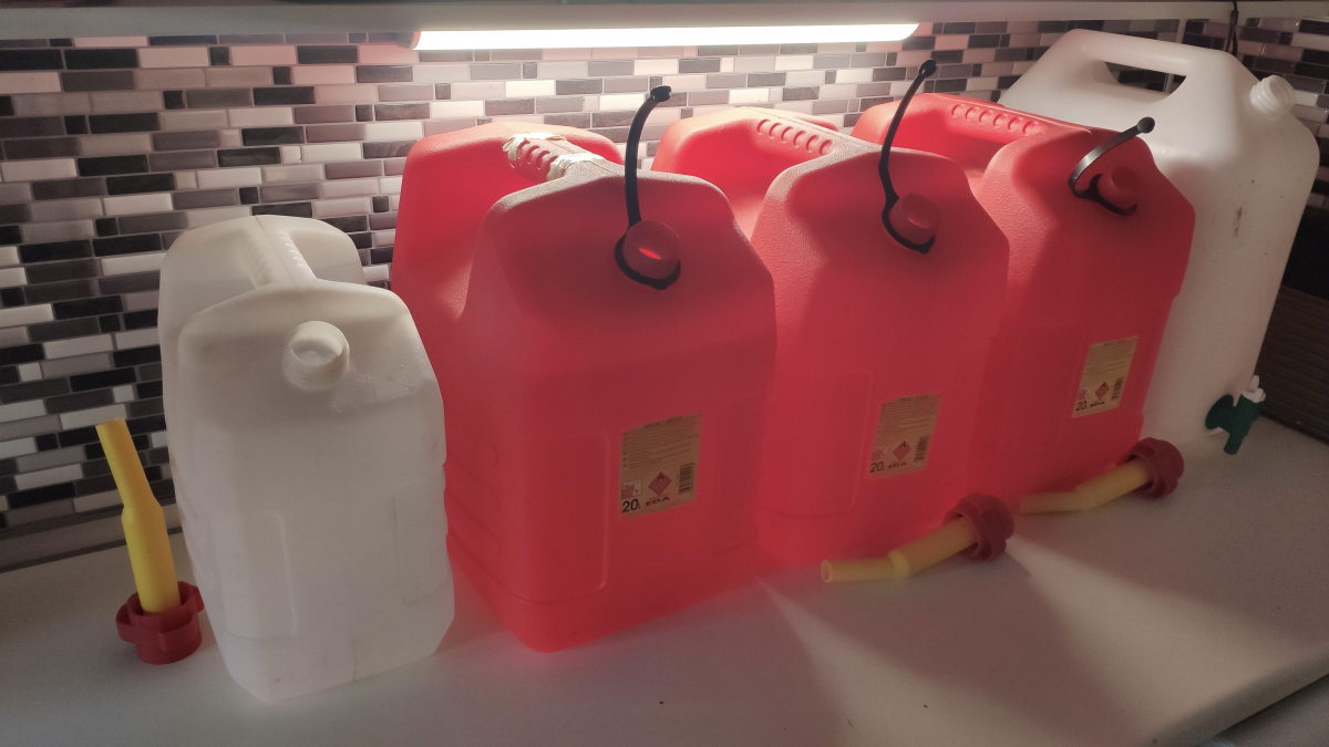 Le jerricane blanc a gauche (10L) sert à faire le niveau et à compenser l’évaporation en semaine....