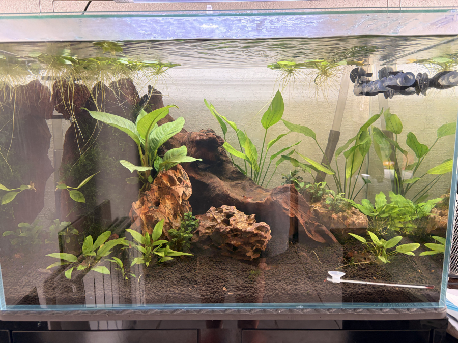 Actuellement peuplé de 13 tetra fantome rouge et 6 crevettes amano(je connais les risques).