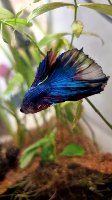 Je reviens de vacances et j'ai remarqué que mon betta avait un début de pourriture des nageoires, du moins je pense. Je suis parti deux semaines, et avant ça il n'était pas ainsi, je trouve que sa nageoire dorsale n'est plus aussi jolie qu'avant.