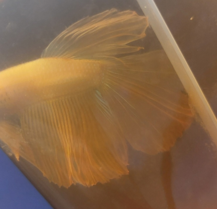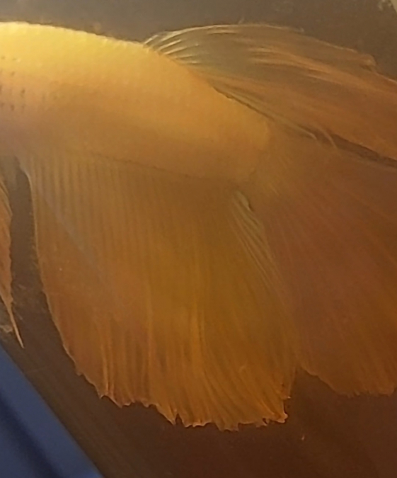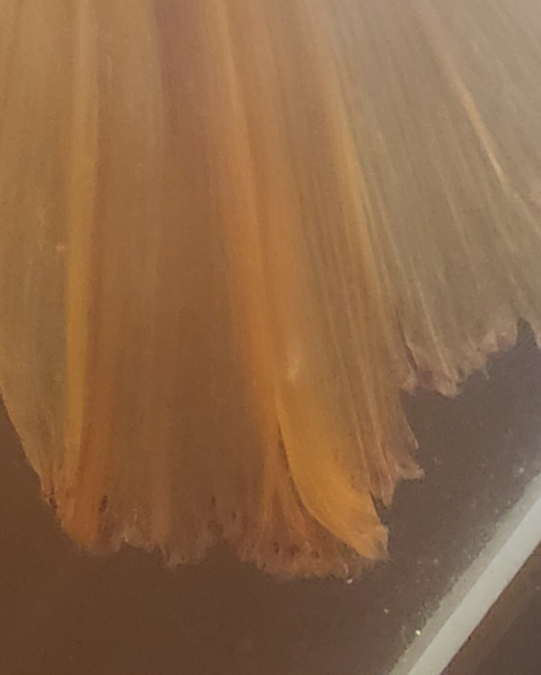 Seulement sa nageoires caudale continue de se ronger, cet après-midi je constate du rouge le long de ses voiles, pourtant en regardant de très près j'ai l'impression d'observer une repousse légère (blanche translucide et régulière.)