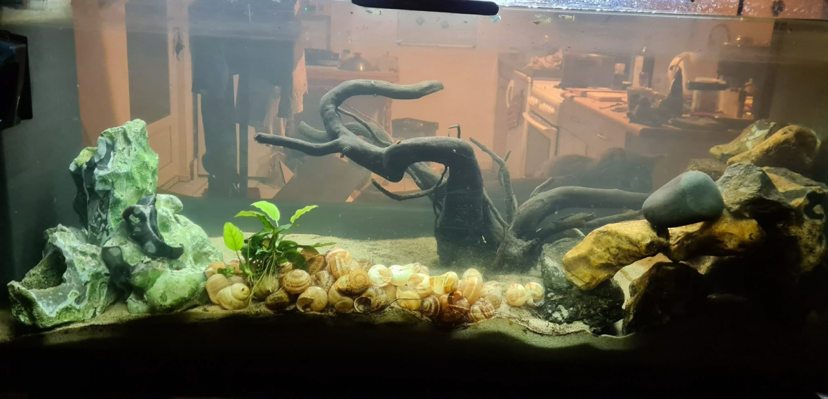 Sol sable très fin, mixte de pierres, 1 anubias bouturée en 3... Afficher la suite