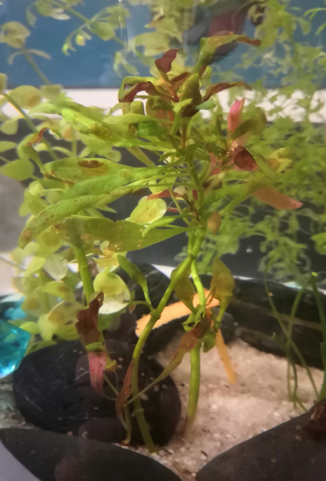 Bonjour tout le monde. Ma question porte sur ma plante rouge au fond. D'abord je ne sais plus quelle espèce c'est. Ensuite, comme vous le voyez, la tige a perdu ses feuilles. Seul le haut en possède. Pensez-vous qu'il est possible de couper la tige et de replanter le haut de la plante ? Quid de la tige restante ? La couper à ras du sable ? La laisser ? Merci.