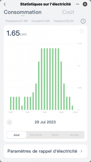 J’ai donc fait l’acquisition d’une prise wifi qui m’indique la consommation électrique réelle passant par elle. On peut définir des montants différents pour les heures pleines et heures creuses, avoir une vue consommation ou coût par jour, semaine, moi etc….