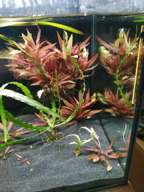 Ca pousse mieux que "planté" (pas de sol nutritif, pas de Co2). Je fertilise via la flotte, Profito et Easycarbo bio. Avec le temps les racines prennent la couleur des feuilles, magenta ici. Avec le temps aussi, on se rend compte que rien n'a vraiment besoin d'être "enterré" (ok, y'a sûrement des exceptions style gazonnante ou autre). Mais s'il y'a assez de nutriments, tout pousse n'importe où, même les plantes à tige, les possibilités esthétiques sont infinis.