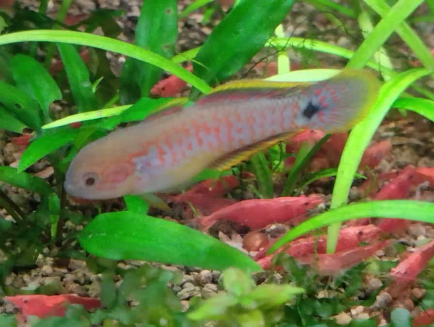 Bonne cohabitation les plantes poussent bien,les crevettes pullulent,les kuhlis regulent les escargots,les Pseudomugil pondent 3 oeufs par jour.