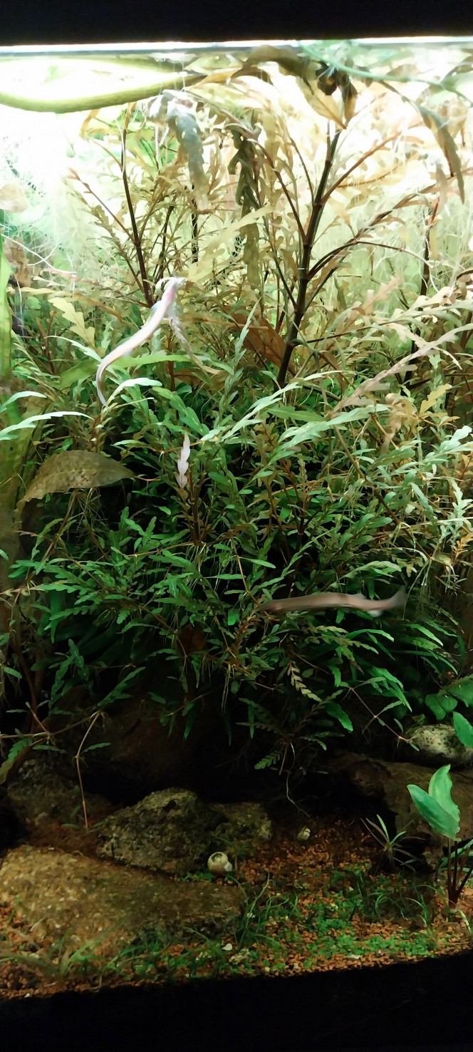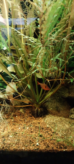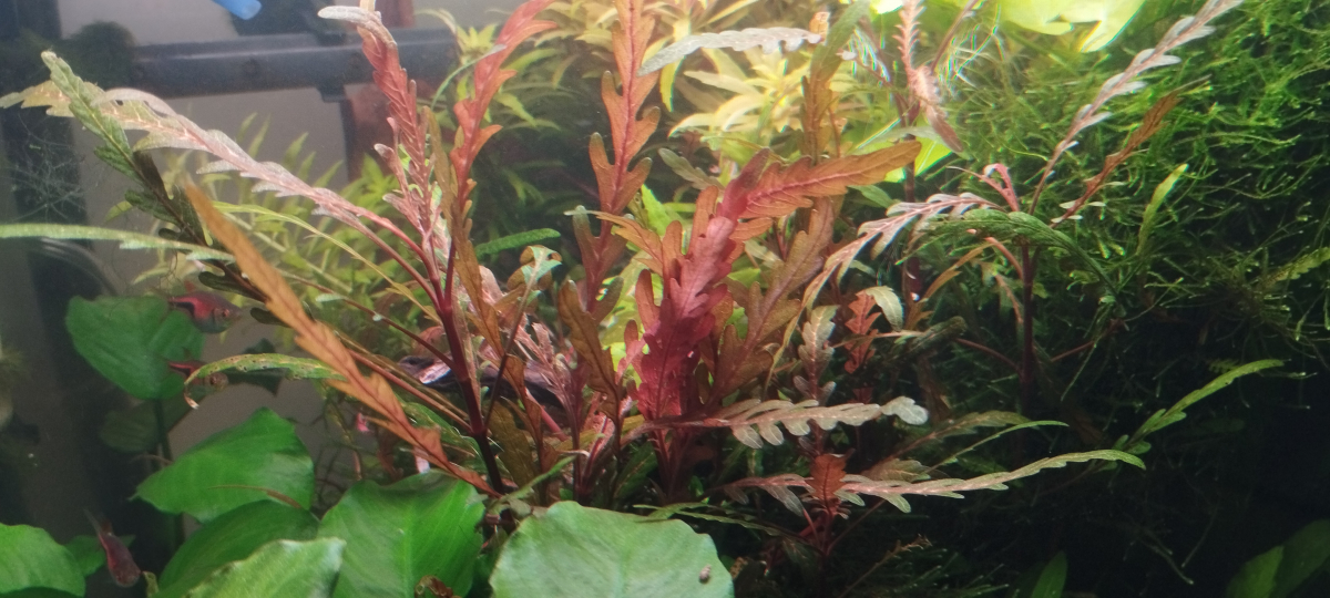 C'est une plante assez capricieuse qui a besoin de beaucoup de lumière, des nutriments et un peu de CO2 pour s'épanouir. J'ai eu beaucoup de mal à la faire pousser au début après plusieurs essais. Je l'ai uniquement dans ce bac en épiphyte. C'est je crois la meilleure façon de la cultiver. Il faut surtout éviter qu'elle se fasse trop envahir par les autres plantes. Chez moi elle est en concurrence avec une plante à croissance rapide, la Limnophila Hippuridoides à l'arrière, qui s'étend très rapidement vers l'avant (à surveiller). La Pinnatifida est mise dans des conditions optimales au milieu du bac, sous le soleil de led WRGB exactement... 😄
