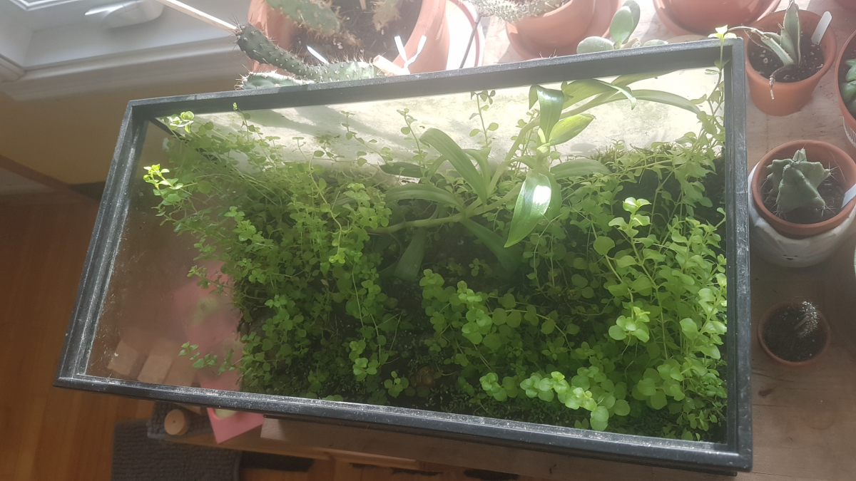 bonjour, j'avais cet espèce de paludarium pour ma crapaude, mais avec ce qui est arrivé à ma mygale (pour ceux qui sont au courant), j'ai pris la décision de la libérer, pour son bien. (Il faut savoir qu'elle était en pleine santé et que le crapaud d'Amérique est indigène d'Amérique, je l'ai trouvé dehors. Aussi, je l'ai libéré dans un boisé à proximité d'un marécage ou abondent les insectes.) Je me retrouve donc avec un bac de 20L ou la nature a pris le dessus.