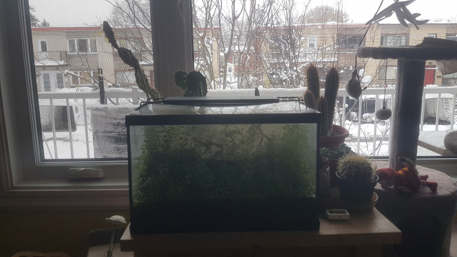 Ma première idée pour le futur de ce bac a été de le démonter, éventuellement en faire un bac hôpital, ce qui, je pense, ne serais pas une mauvaise idée, et ça ferais de la place pour mes succulentes et cactus qui partagent cet espace. Je trouve dommage que certains que j'aime beaucoup se retrouvent cachés derrière l'aquarium.