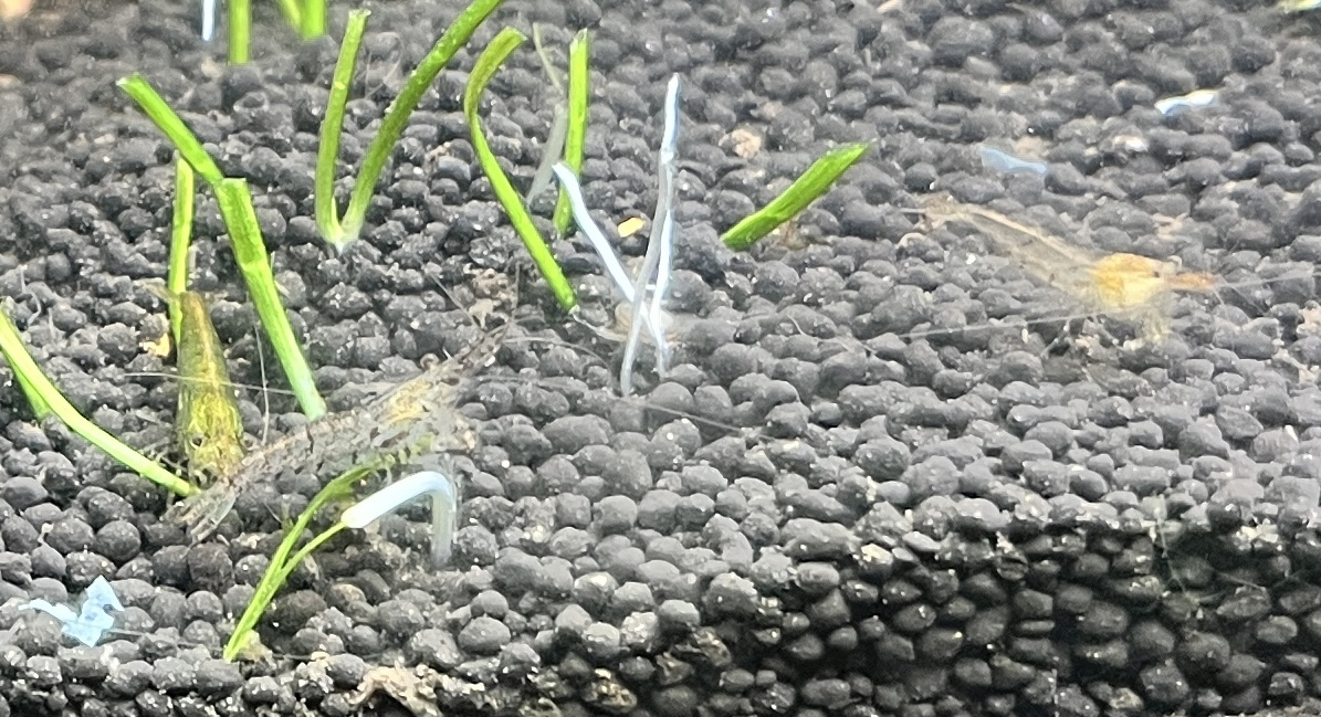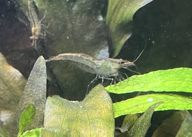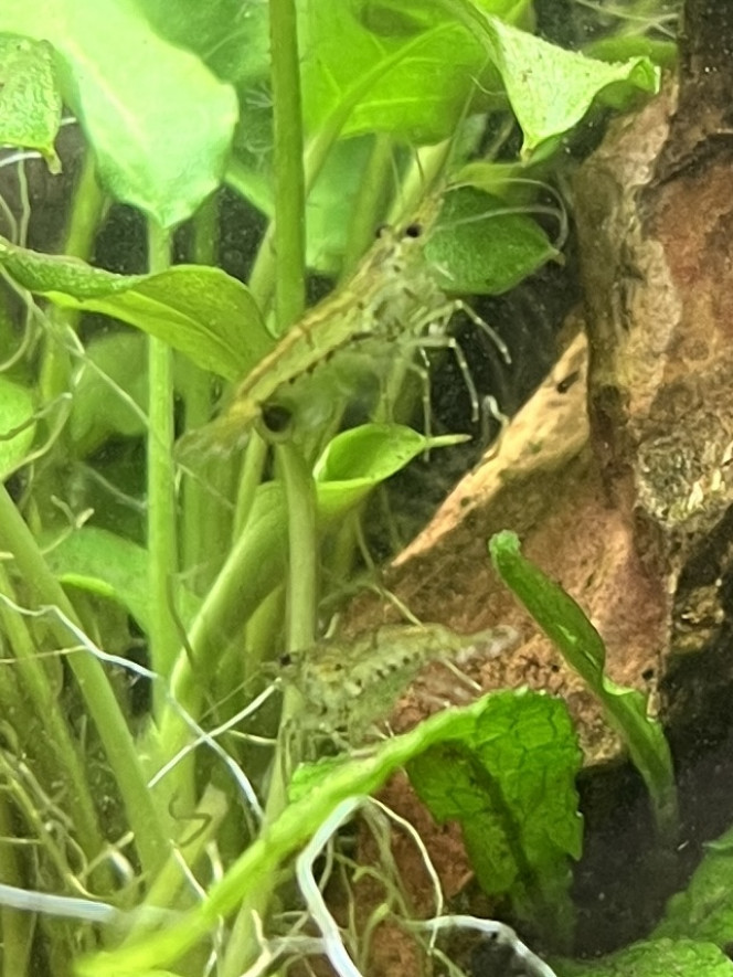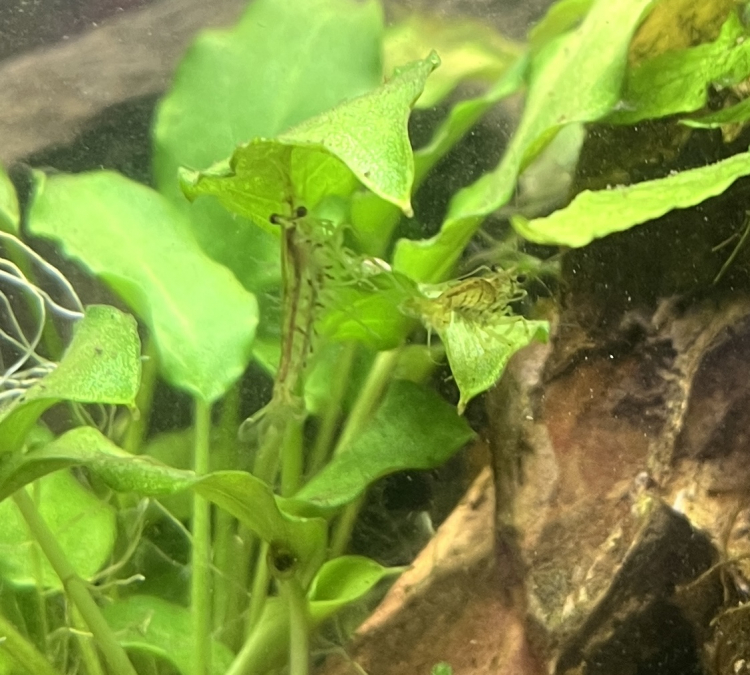 Les photos ne rendent pas hyper bien, le côté jaune c’est plutôt un reflet car les juvéniles sont très claires, presque transparentes puis elle prennent des teintes brunes / grises / vert en grandissant. Elles ne font pas plus de 2cm mais certaines translucides avec des points noirs sur les flancs ressemblent à s’y méprendre aux quelques Japonica Amano que j’ai, bien que ces dernières soient bien plus grosses (4/5cm).