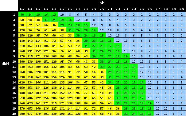 je m'explique : tu peux faire un changement d'eau de 50 % avec l'eau osmosée en remplissant ton bac très lentement (comme si tu acclimaté une espèce avant de l'introduire) pour atteindre grosso modo les paramètres cités, tout en contrôlant durant le processus la conductivité et le kh ). Pour le co2 entre 15 et 25 mg/litre (drop vert ) regarde ce tableau pour que tu puisse avoir un idée des valeurs .