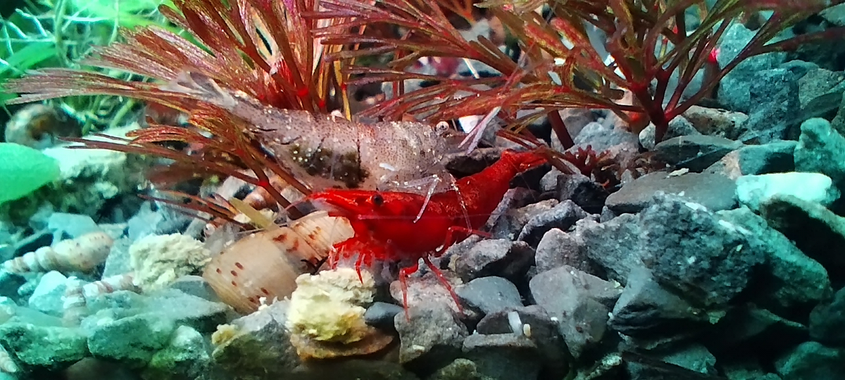 Les Caridina Malawa se multiplient énormément, ce qui doit compenser les pertes. Et les NC Bloody Mary s'en sortent pas mal non plus. La sélection se fait naturellement. Les jeunes les plus degourdies survivent...