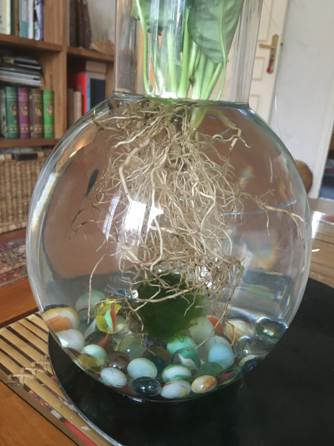 Je possède un aquarium bulle avec un col pour qu’une plante pousse à l’extérieur avec les racines dans l’eau.