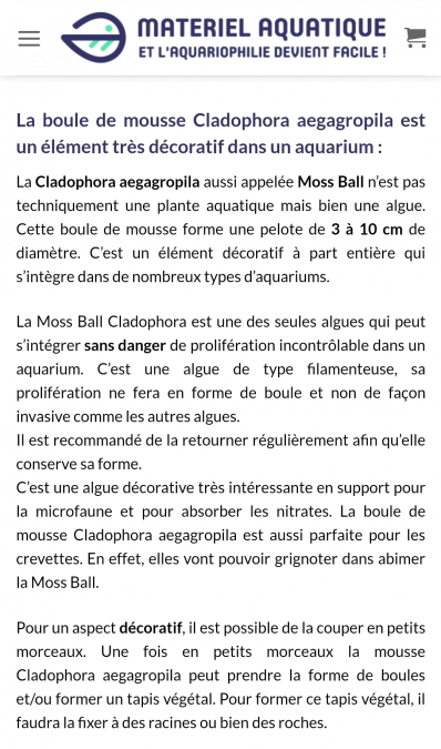 @Emy34 Oui alors ça c'est le texte type d'un vendeur et comme tout vendeur il est là pour vendre ses produits. Et le coup de la boule anti-nitrates c'est des conneries ça ne fait rien de plus qu'une plante ne ferait, sans danger d'invasion pour ton bac. La cladophora c'est une algue et comme n'importe quelle algue elle profitera du moindre déséquilibre pour envahir ton bac. Pour l'instant c'est tout mignon c'est une petite boule et les crevette vont dessus alors on dirait que c'est même une bonne chose pour ton bac mais.... c'est une algue !