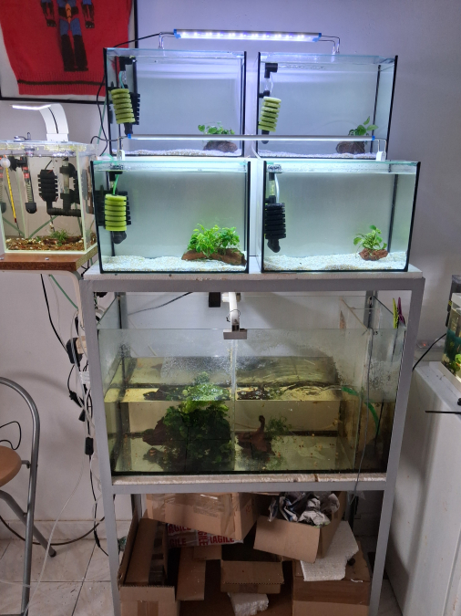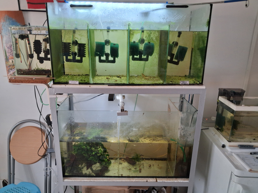 Aquariums installés sur la longueur pour avoir une nouvelle vision des crevettes.