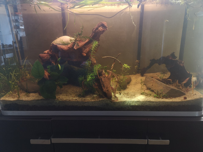 Merci ! Je l'ai trouvée en bord de rivière, il y a un an, oubliée dans le jardin, et elle rentre pile poil dans la largeur de l'aquarium (ça touche 😅). Je l'ai grattée, quasiment sculptée car il y avait pas mal de bois en décomposition. Après je l'ai faite bouillir, j'ai dû quand même la lester car elle ne coulait pas complètement.
