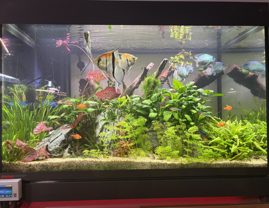 C'est deroutant. De premier abord, je trouve que les scalaires et les poissons bleus (qui sont quelle espèce ?) font serrés.