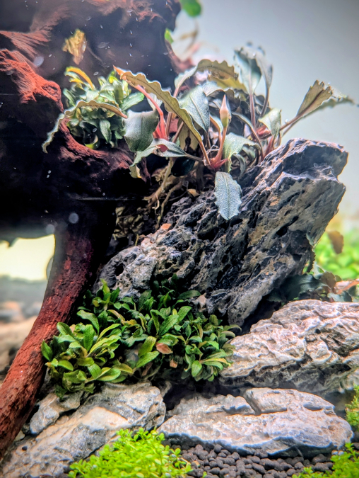 En effet l'hemianthus et l'eleocharis mini avaient bien pris racine et la rotala H'ra Vietnam , la staurogyne et l'hydrocotyle tripartita mini montraient de bons signes de reprise également avec la croissance de nouvelles pousse bien visible .