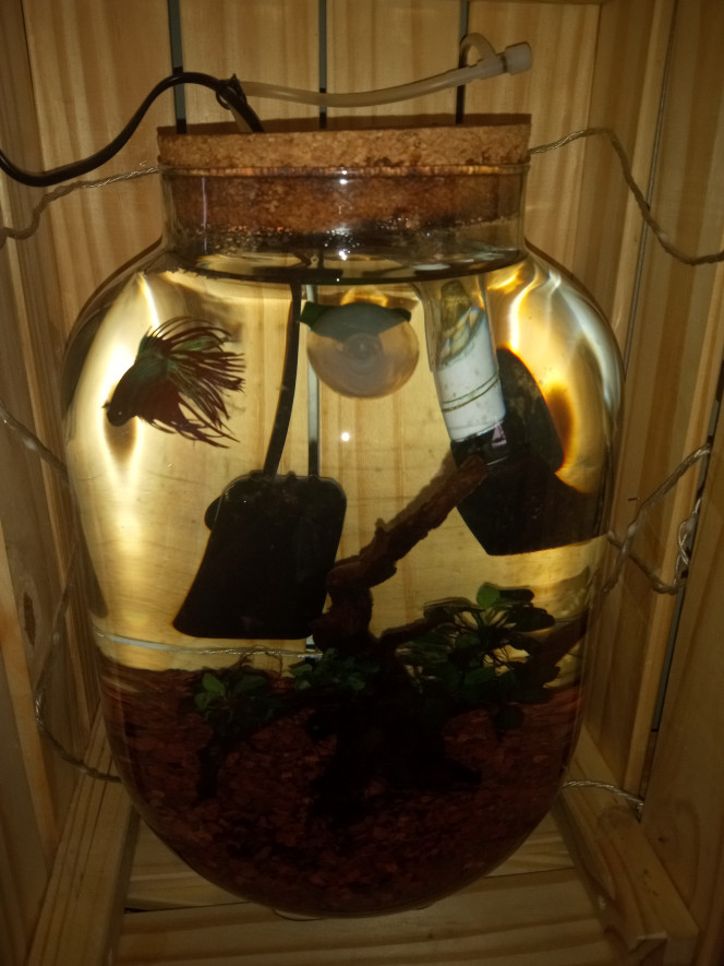 Par contre, pour la forme du contenant, elle n'est pas du tout épanouissante pour un poisson à voiles longs qui a tendance à aller se cacher dans les plantes flottantes ou aller à la surface régulièrement piper l'air. Et effectivement, l'ouverture étroite n'est pas non plus adéquate pour une bonne oxygénation du bac.